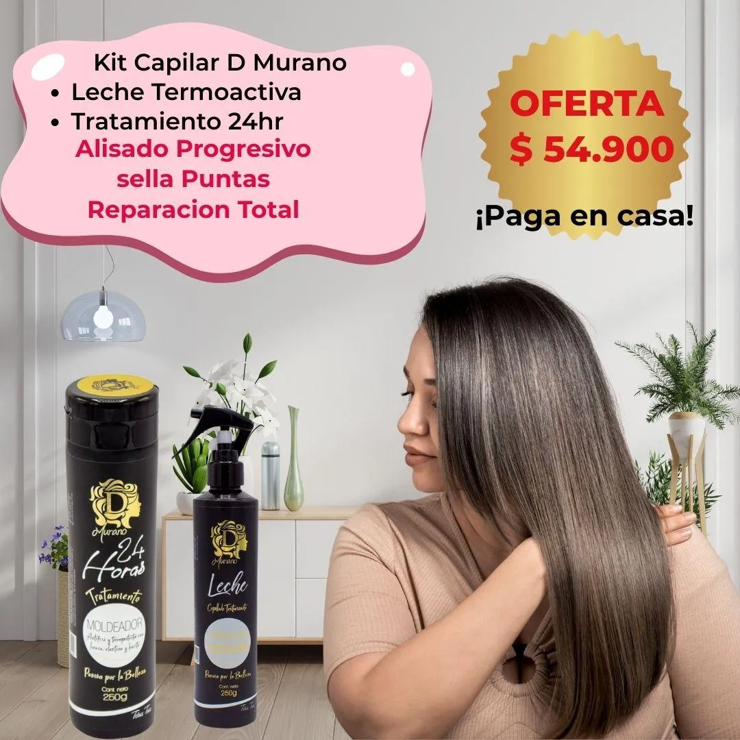 Tendrás un cabello con mas cuerpo , hidratado, sin frizz y cero puntas abiertas. Nuestro Kit D Murano esta creado a base de extractos botánicos como, linaza, elastina, karité, y extracto de coco; que hidratan, restauran, moldean y estimulan el crecimiento, además contiene proteínas y ceramidas que fortalecen la estructura del cabello, aumentan la elasticidad, fortalecen y reparan la fibra capilar. Con Nuestro Kit D Murano utiliza las herramientas de calor sin miedo. ¡No esperes mas para lucir tu cabello siempre impactante!